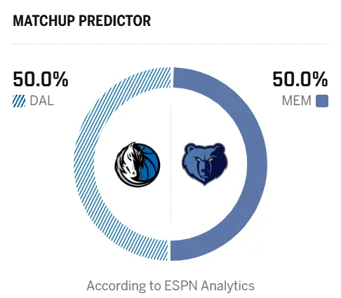 赛前,美媒ESPN预测本场比赛,独行侠胜率50.0%,灰熊胜率50.0%。