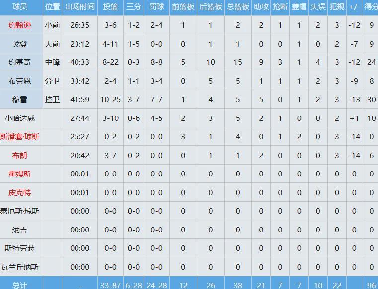 掘金那边两大核心继续进攻状态不佳,约基奇投篮22中8贡献24分15板9助3断,穆雷出手25次仅中10球砍下30分5板5助。